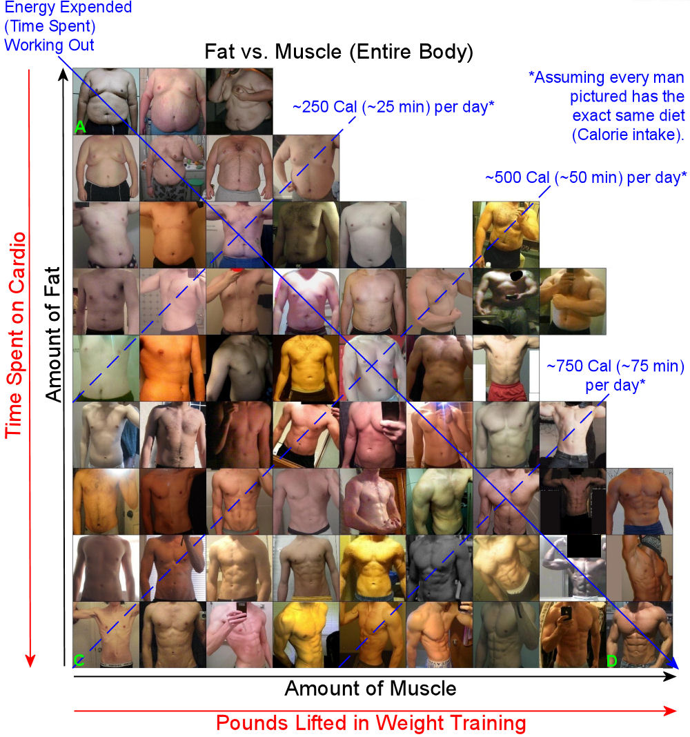 Here’s my chart of fat vs. muscle when looking at the entire body. It’s important to see here that muscle and fat are independent axes—x and y. That is, muscle + fat = body; X coordinate + Y coordinate = body type “tile”. It's muscle and fat—not muscle or fat; it’s not a simple spectrum that goes from fat to muscular. A, B, C, and D are the 4 corners of the chart and represent the 4 extreme body types: A is complete disuse of the body and very high Calorie intake. B is not pictured but it is the top right corner. This is the typical “strongman build,” a.k.a. “bear mode.” This is having a lot of fat and muscle. This body type is accomplished by doing one or two repetitions of very heavy lifting. C can be achieved two ways: one, disuse of the body and very low Calorie intake; two, a normal diet plus at least an hour of cardiovascular exercise every day. This is the typical “marathon-runner build.” A couple tiles to the right of C would be a “swimmer’s body,” a.k.a. “otter mode.” D is only possible by taking steroids or dedicating most of your day to working out. The body types in the leftmost column (from A to C; e.g. obese, fat, “skinny-fat,” skinny) are the only body types that can be achieved in two distinct ways. One way is to have a regular Calorie intake and then expending Calories through cardio exercise, such as jogging for 0 (for Body A) to ~180 (for Body C) minutes every day. The second way is to restrict Calorie intake and never exercise or do physical work. The mantra “Calories in, Calories out” is not even relevant to people who live like this. This is a popular lifestyle among women, especially in East Asia, and based around the idea that it is masculine to perform any physical work. For all other body types (right of the leftmost column)—for any kind of muscle development—physical work must be done. If you start at Body Type A and begin the P90X workout program, your progress will follow the blue line. P90X is what’s considered a “high volume” workout with weights. (“High volume” means there are lots of sets. So it’s basically cardio with weights.) If you start at A and begin the Insanity workout program, your progress path will end a couple tiles to the right of C. Insanity workouts don’t involve dumbbells and are therefore more cardio-oriented. In addition to bodies, any workout can be plotted on this chart because every workout has a certain degree of weight training (x-axis) and a certain degree of cardio (y-axis). Thus, if you do the same workout every day, your body will transform into the body tile located where the workout is plotted. Let’s say you do P90X workouts 4 days of the week and jog a half marathon 1 day of the week, and do this routine for many months. For sake of example, say P90X is plotted at the very center tile with the blue lines crossing. The half marathon should be plotted at C. Thus, your resultant body would be one tile left and down from the center.