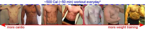 Here’s the same chart rotated 45° right and cropped to show all the body types one could possibly attain by working out ~50 minutes a day. Even though muscle and fat are independent axes, building muscle and losing fat nearly always happen simultaneously. There are only a few exercises that don’t work on both simultaneously. One would be doing jumping jacks for an hour. This is as close as it gets to resistance-free exercise—pure cardio. This is therefore strictly fat reducing. Resultant body type: C. The other extreme is pure muscle-building and no cardio. This would be lifting an extremely heavy weight just once. For example, one rep of bench press (your max), one rep of leg press (your max), etc. Resultant body type: B, “strongman build.” Lifting a weight for more than one repetition is also doing “cardio” and thus burning fat. For instance, if a guy does ten reps of bicep curls, he will gain bicep muscle and lose fat around the bicep. As you can imagine, it’s very rare to only gain muscle or only lose fat.