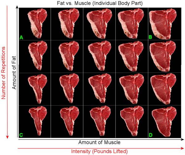 I’ve used a steak to represent a single body part. Intensity is already understood and accepted today: the more pounds you lift with a certain body part, the bigger its muscle will be. For instance, you can focus weight-training your biceps only and have only that muscle develop; doing bicep curls will not lead to a six-pack. “Spot reduction” of fat, however, is not accepted by today’s society at all. Its non-acceptance is simply due to anecdotes: no one is isolating a body part and doing high-repetition exercise of that body part for hours on end—at least knowingly! High repetition doesn’t have to necessarily come from a workout. In 99.99% of cases it comes from manual labor. If a person folds shirts at work all day, that is 4,000+ reps of resistance-free bicep training. As a result, their arms would be like Steak C—fat-free. I believe different body types (i.e. locations of fat storage) arise from people unknowingly using certain body parts with high reps in their daily routine. Because fat varies by body part like muscle, one’s “body fat percentage” is kind of meaningless. The term “body fat percentage” only perpetuates the incorrect notion that fat is uniformly distributed throughout the body. Why does it matter that fat gain and loss can occur at a single body part? Because women do not want to lose fat indiscriminately. They want to retain breasts and booty while losing tummy fat, arm flab, etc. Most women want breasts and a booty between Steak A and B—actually, they probably want more fat than shown. As the chart shows, this is achieved by keeping the number of repetitions at the chest and butt to a minimum. This means no kickboxing classes (a high-repetition chest exercise), no long-distance running (a high-repetition butt exercise), and so on. Complete disuse of the chest and butt would produce Steak A. Some women prefer a foundation of muscle underneath the fat for “shapely” breasts and booty—Steak B. This is accomplished with high-intensity—yet low-repetition—chest and butt exercises. For example, doing a few very heavy bench presses and sprinting at full speed for 15 seconds. Obviously, a woman wouldn’t work out all her body parts in this manner unless she wanted the “strongman” physique.