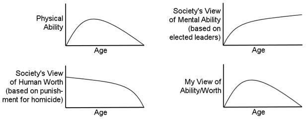 Human Worth with Age In my opinion, today’s society has a horrible view of a person’s value based on age. The worst consequence of this is that great power (money) is granted to old people. Presidents, leaders, CEOs, coaches, etc. are all old, and we chose to put these people in charge. I believe society assigns great value to old people for two reasons: firstly, we’ve always been told to respect them. Secondly, society believes experience trumps all. Society does not believe that mental ability can worsen over time. I believe it diminishes alongside physical ability; when we get old, we lose the ability to learn – connect thoughts, separate thoughts, recall thoughts, and create thoughts. Einstein was only 26 years old when he had his “miracle year”. To me, the world made more sense when young people ruled nations. Ancient Egypt had the right idea. When has anyone old ever done anything impressive or valuable for society? Has anyone old ever invented something? I’m not just talking about productivity, but also recollection ability – old people don’t win on Jeopardy. Only old people have power in this world, and they constantly make bad decisions for the populace. The elderly demand great respect, but that doesn’t make them invaluable.