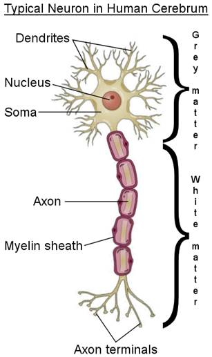 Front view of grey and white matter activation during IQ test. (Haier et al. 2005) What are grey matter and white matter? Well, the brain is made up of ~100 billion neurons. At the neuronal level, the dendrites, soma (cell body), and nucleus are classified as grey matter. The axon and axon terminals are classified as white matter due to their white appearance, which comes from being covered in myelin. This is summarized here: