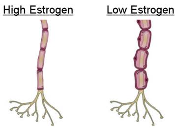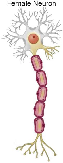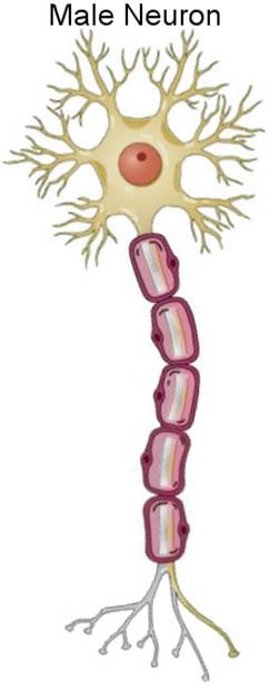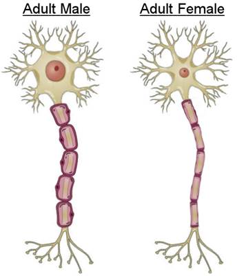The soma is not the only part of the neuron to be affected by hormones. Another study found that as humans go through puberty, myelin sheath greatly increases in size for males and barely increases for females. Myelin is a layer of insulation that surrounds axons. Lipids, a.k.a. fat, make up 80% of the dry mass of myelin. Earlier, I had hypothesized that axons are strongly used by females. Why then would myelin sheath barely grow in females? Today, scientists believe that the purpose of myelin is to improve signal transmission across the axon. I believe that myelin simply materializes from disuse in the exact same way that fat does on our arm. As Leonardo da Vinci said, "Inaction saps the vigors of the mind." So as males undergo puberty (i.e. a drop in estrogen level), the myelin sheath thickens due to disuse of the axon and axon terminals—due to neglect of divergence. This picture summarizes what I believe estrogen does to the myelin: