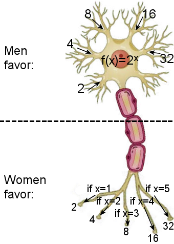 The Fundamental Difference between Men and Women, Part 1: Neurons Why does a girl “throw like a girl”? In fights, why do men swing their limbs, while women grab and scratch? Why do men focus on a woman’s physical appearance, while women focus on a man’s personality and behavior? Why do women have breasts? Why do women like clothes so much? I have a simple, consistent explanation for every observed difference between men and women. In this article I will focus on the male and female brain. To understand this article, you should first read my article on Thought. Men and women think very differently, yet our brains appear identical. Many scientists have sought to find the big difference between the male and female brain. One of the only differences they’ve found is that a man’s brain is typically 10% larger than a woman’s brain. This difference is negligible, however, after accounting for the fact that a man’s body is about 10% bigger than a woman’s body. Scientists have also found that certain regions of the male brain to be a few percent bigger, or certain regions of the female brain to be a few percent bigger, but nothing truly statistically significant… until Haier in 2005. His study found that “men had roughly 6.5 times the number of grey matter [3D pixels] identified as related to intellectual functioning as did women, and women had roughly 9 times more white matter [3D pixels] than did men.” This is worded strangely, but I interpret it as meaning: when performing the same IQ test, on average, men use grey matter 6.5 times more than women; furthermore, women use white matter 9 times more than men. These numbers are hugely statistically significant. To clear up any confusion, the actual mass of grey matter and white matter are roughly the same between men and women (after adjusting for the 10% body size difference); if men had 6.5 times more grey matter than women it would be obvious by just looking at the brain with the naked eye. Thus, I believe the gender difference lies in how the brain is used.