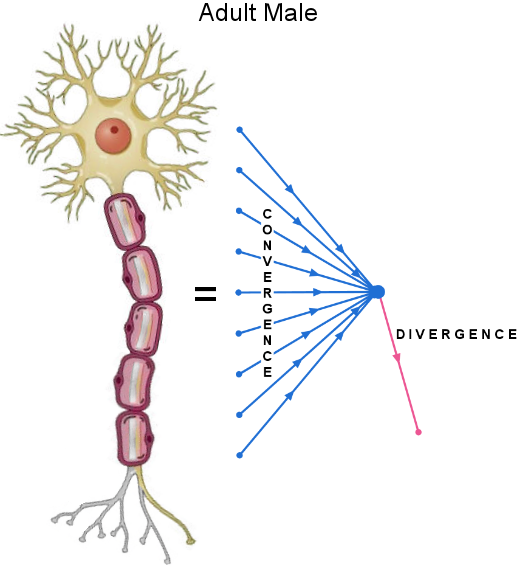 Gold denotes use and grey denotes disuse. Notice how the male neuron uses 6.5 times more dendrites than the female neuron. Notice how the female neuron uses 9 times more axon terminals than the male neuron. Note that this is a visualization of the typical, or average, neuron of the cerebrum—the number of dendrites and axon terminals varies from neuron to neuron. “6.5” and “9” describe how the neuron was used during the IQ test administered by Haier, but I am extrapolating these findings to everyday thoughts. You may recognize the picture above because I used it in Thought to describe convergence and divergence. These are terms I made up to explain my hypothesis. I hypothesize that there is only one difference between the male and female mind: at the neuronal level, males prefer to use the dendrites, soma, and nucleus (i.e. grey matter); whereas females prefer to use the axon and axon terminals (i.e. white matter). Or, in my own terms: males favor convergence and its products, whereas females favor divergence and its products. This hypothesis applies to the typical male and the typical female. Obviously, there will be outliers: men who think like women, women who think like men, androgynous men, and androgynous women. I define convergence as the process of information coming together. More specifically, it is inductive reasoning, connecting thoughts, or finding a similarity. This means the product of convergence is information that has come together: a general thought, a universal thought, or a similarity. Looking at the neuron, this is what males emphasize: