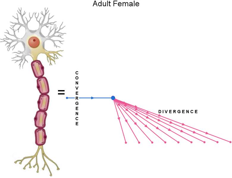 This shows my hypothesis of how the typical adult male uses neurons in the cerebrum. Notice the imbalance: many dendrites are used while only one axon terminal is used. Convergence (shown in blue) is favored. Thus, the adult male pays attention to information that is presented simultaneously, as represented by the nodes lined up vertically, and general information, as represented by the center node. Divergence (shown in pink) is disfavored. The adult male barely pays attention to specific information. As a girl becomes a woman, her testosterone level drops and estrogen level rises. These changes cause the neurons to increasingly disfavor convergence and increasingly favor divergence, respectively: