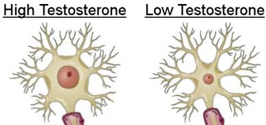 The adult female develops the ability to use large amounts of information in the process of divergence. The adult female pays attention to specific information that is presented sequentially (i.e. over time), as represented by the pink nodes lined up horizontally. The adult female barely pays attention to general information, as represented in blue. As I mentioned, testosterone and estrogen can cause the neurons to become sexually-dimorphic. As more estrogen enters one’s brain, the thoughts become more “divergent”, “feminine”, or “womanly”. As more testosterone enters one’s brain, the thoughts become more “convergent”, “masculine”, or “manly”. This claim is (kind of) supported by studies on rats. When testosterone was injected in rats, the soma grew bigger. Again, the soma, a.k.a. cell body, is the area between the dendrites and the nucleus of a neuron. The way I interpret this result is that the dendrites became capable of putting more information together and this manifests itself as an enlarged soma. In another study, rats were castrated and thus no longer able to produce testosterone. Their neurons had smaller soma than neurons of normal rats. These studies can be summarized by the following picture: